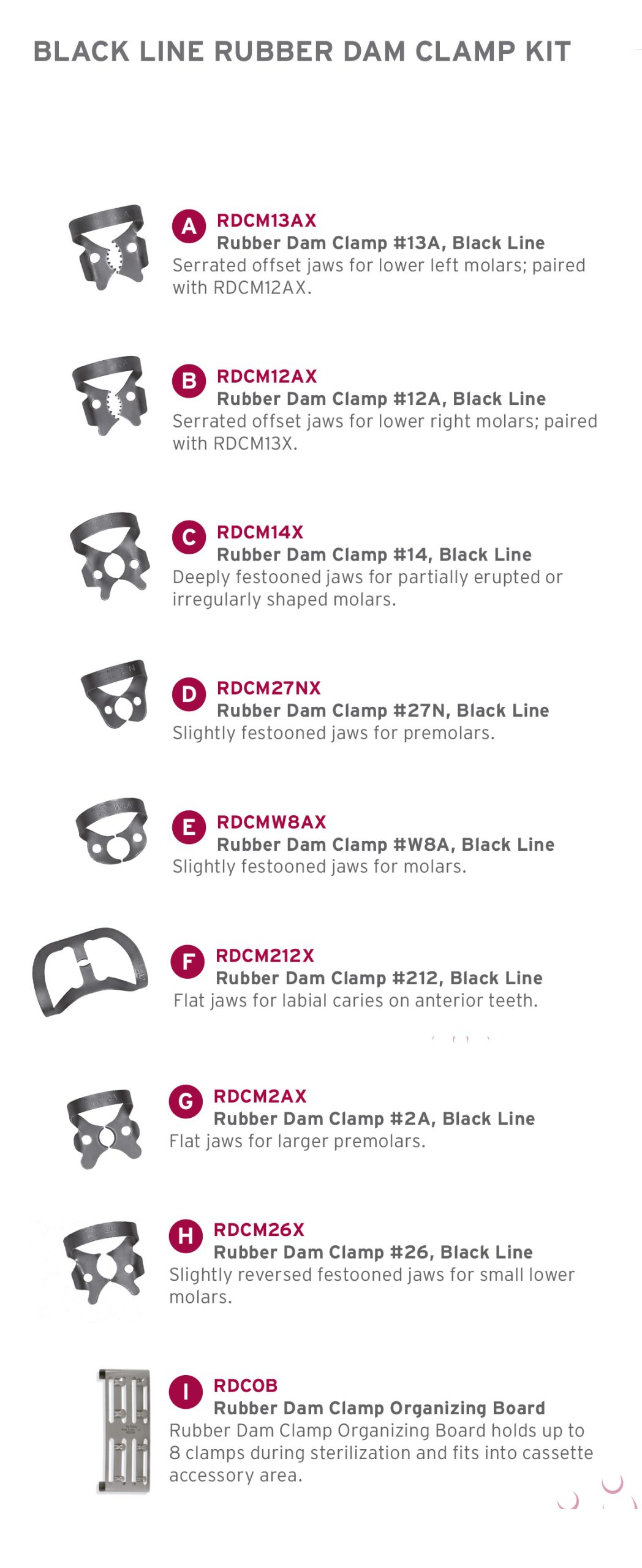 Pinza de dique de goma con recubrimiento oscuro. Mejora la visibilidad intraoral al ofrecer un contraste excepcional. Ofrece un ajuste seguro y máxima resistencia.