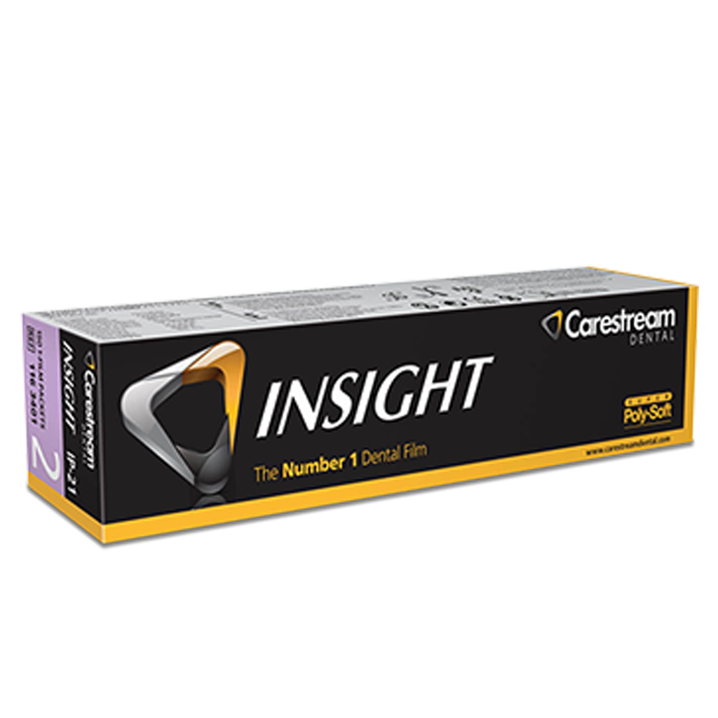 Película radiográfica dental intraoral (periapical) de exposición directa: la de más alta velocidad del mercado (reduce el tiempo de exposición). La película dental CARESTREAM INSIGHT es la nueva película de rayos X intraoral más rápida y capaz de reducir la exposición a la radiación hasta un 60% en comparación con las películas de velocidad D.