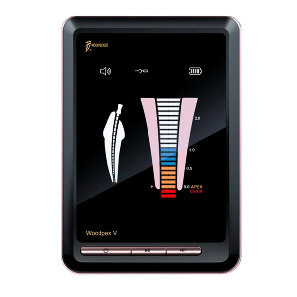 El Woodpex V es un localizador de ápices con un sistema avanzado de tecnología de radiofrecuencia para la máxima precisión en la medición y trayectoria de las limas en los tratamientos de preparación del canal radicular aún cuando hay sangre o pulpa residual en el canal. Su pantalla LCD de 4,5″, luminosa y clara permite un seguimiento fácil de la trayectoria de la lima en varios colores y, además, sus señales acústicas aportan la máxima seguridad al odontólogo. Su calibración automática asegura medidas más acertadas y posee también un diseño elegante y moderno, con una gran pantalla inclinable para mayor comodidad. La capacidad de precisión del Woodpex V es del 97.71% y sus accesorios pueden ser esterilizados en autoclave para evitar infecciones cruzadas de manera efectiva. Cuenta con batería recargable. Compatible para utilizar con el motor de endodoncia ENDO SMART PLUS.